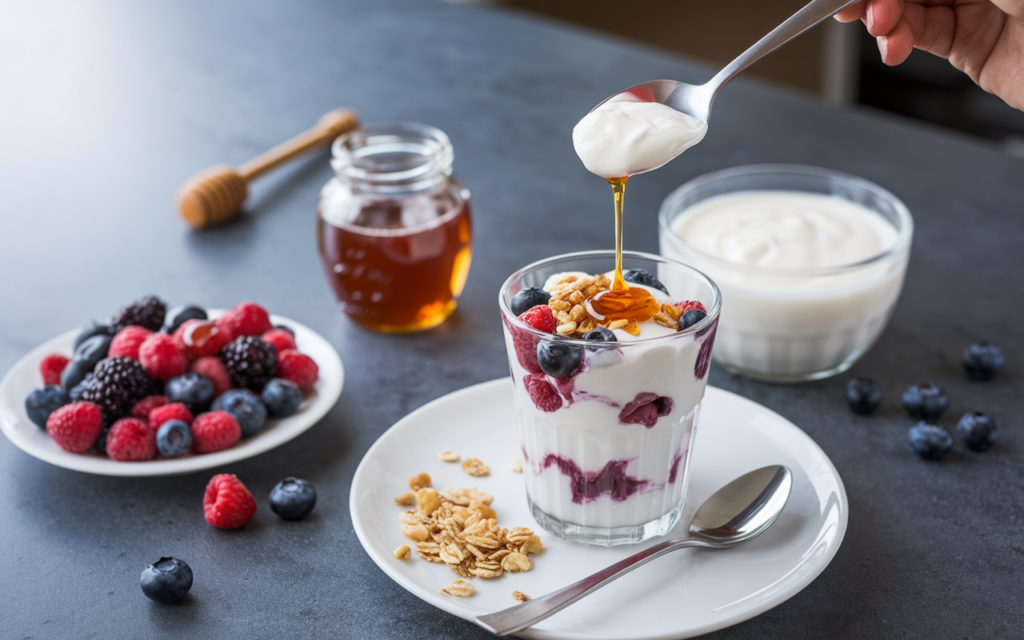 - Ingredients: Greek yogurt, honey, and fresh fruit (like berries or mango).