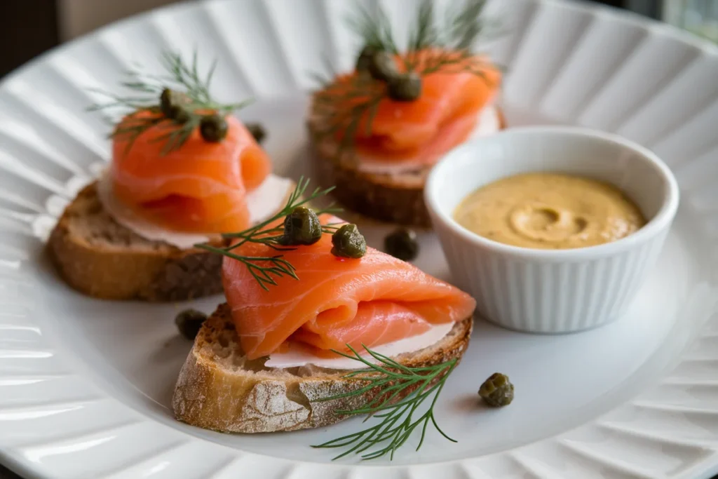 - Smoked Salmon Canapés: Bite-sized pieces of smoked salmon on toast or crackers with a dollop of crème fraîche, a sprinkle of dill, and a squeeze of lemon juice. Prepare ahead and chill until serving time.